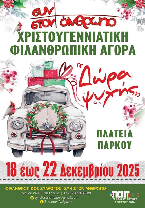 Η μεγάλη Φιλανθρωπική Αγορά ”Δώρα Ψυχής” από τον ”Συν στον Άνθρωπο” για τις γιορτές των Χριστουγέννων ξεκίνησε το πρωί της Πέμπτης (18/12) στην πλατεία Πάρκου. Οι εθελόντριες του Συλλόγου ετοίμασαν, όπως κάθε χρόνο, πολλά προϊόντα και δώρα, με σκοπό τα έσοδα να διατεθούν εκεί που υπάρχει πραγματικά ανάγκη.