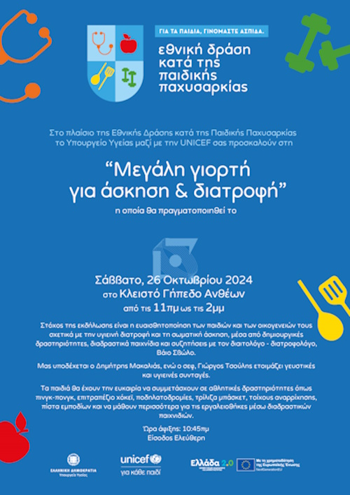 Το Σάββατο 26 Οκτωβρίου 2024 στο Κλειστό Γήπεδο Ανθέων από τις 11 π.μ. έως τις 2 μ.μ., παρουσία της Αναπληρώτριας Υπουργού Υγείας, Ειρήνης Αγαπηδάκη, θα πραγματοποιηθεί η εκδήλωση «Μεγάλη γιορτή για άσκηση & διατροφή», μέσα από δημιουργικές δραστηριότητες, διαδραστικά παιχνίδια και συζητήσεις με το διαιτολόγο – διατροφολόγο, Βάιο Σβώλο.