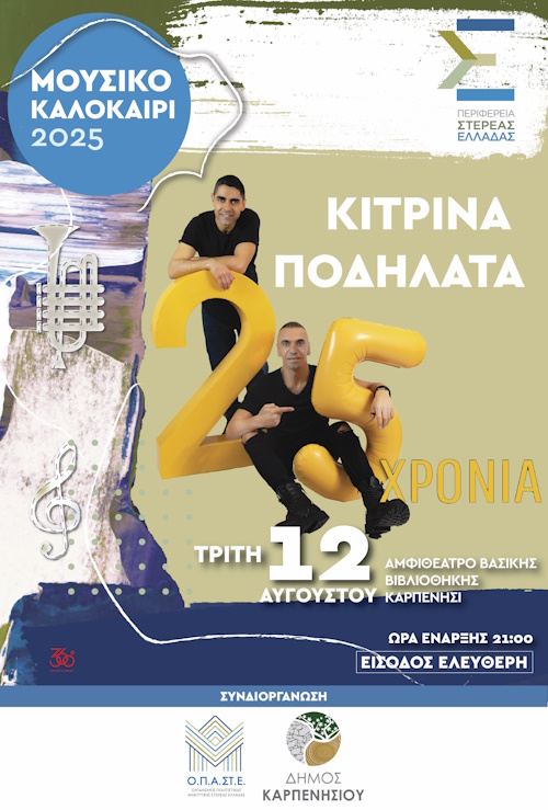 Συναυλία με το ροκ συγκρότημα “Κίτρινα Ποδήλατα”, στο Αμφιθέατρο της Βασικής Βιβλιοθήκης Καρπενησίου την Τρίτη 12 Αυγούστου στις 9μμ. Τα “Κίτρινα Ποδήλατα” γιορτάζουν 25 χρόνια δημιουργίας και παρουσιάζουν τις σημαντικότερες στιγμές της πορείας τους, ενισχυμένες με τα μηνύματα του νέου τους album.
