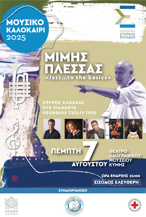 Συναυλία αφιέρωμα στον Μίμη Πλέσσα υπό τον τίτλο: “Jazz…to the basics” με τους Σπύρο Κλείσσα, Εύη Σιαμάντα και το “Georgios Tsolis Trio”. Θα πραγματοποιηθεί στο Θέατρο του Λαογραφικού Μουσείου Κύμης την Πέμπτη 7 Αυγούστου στις 9μμ. Ένα ταξίδι στις απαρχές της Ελληνικής Jazz, μέσα από το έργο του Μίμη Πλέσσα.
