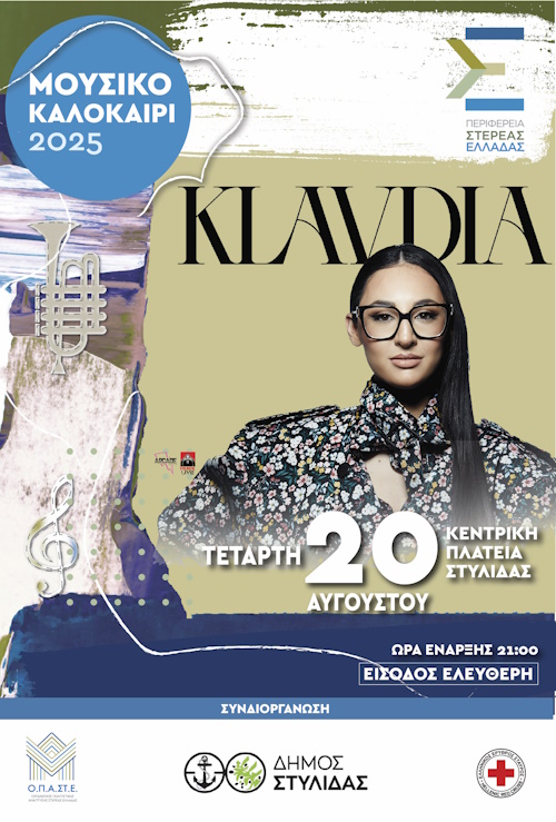 Συναυλία με την Κλαυδία, στην Κεντρική πλατεία Στυλίδας, την Τετάρτη 20 Αυγούστου στις 9μμ. Μετά την εξαιρετική της παρουσία στον διαγωνισμό τραγουδιού της Eurovision, η 22χρονη υπόσχεται να μας ταξιδέψει στη μουσική και στο συναίσθημα σε μια μοναδική βραδιά.