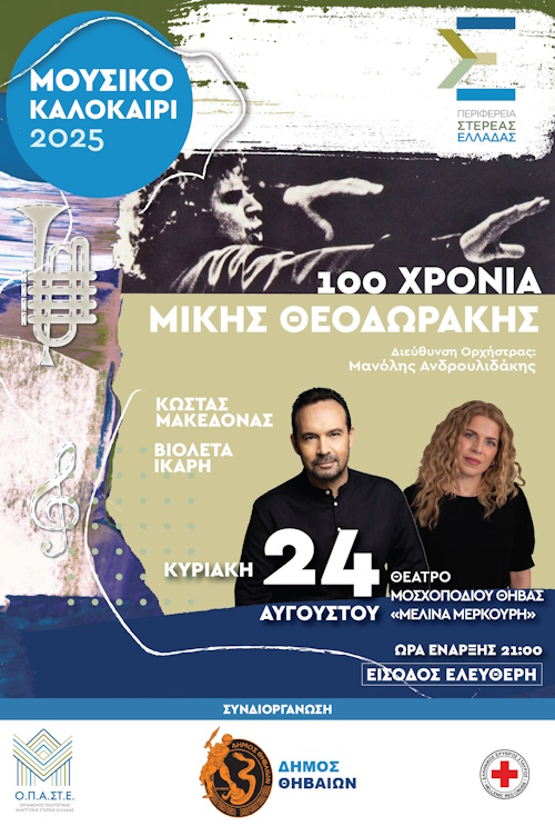 Αφιέρωμα “100 χρόνια Μίκης Θεοδωράκης”, που θα παρουσιαστεί στο πλαίσιο του φεστιβάλ “Πινδάρεια 2025”, την Κυριακή 24 Αυγούστου στις 9μμ. στο Θέατρο Μοσχοποδίου Θήβας “Μελίνα Μερκούρη”. Ερμηνεύουν ο Κώστας Μακεδόνας και η Βιολέτα Ίκαρη. Διεύθυνση ορχήστρας: Μανόλης Ανδρουλιδάκης. Ένα ξεχωριστό αφιέρωμα στον κορυφαίο Έλληνα συνθέτη γεμάτο ιστορίες ζωής, μνήμες, εικόνες και μελωδίες.