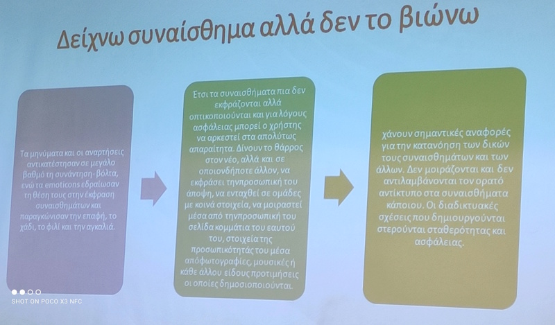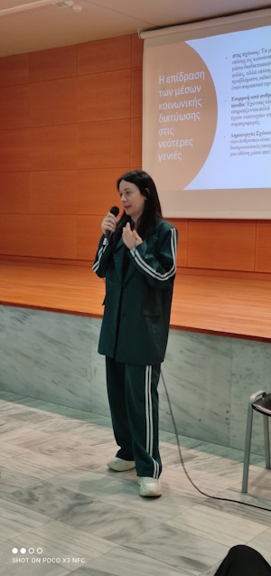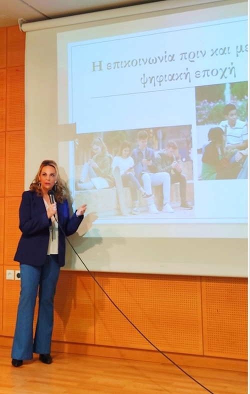 Οι προσκεκλημένες ομιλήτριες κα Μαρία Ζούνη (Κοινωνιολόγος) και η κα Ασπασία Σκούρα (Ψυχολόγος), παρουσίασαν το θέμα με επιστημονική πληρότητα και κατάρτιση. Μέσα από τις εισηγήσεις τους ανέλυσαν τη μετάβαση από την παραδοσιακή στην ψηφιακή μορφή επικοινωνίας, αναφέρθηκαν στην χρησιμότητα της τεχνολογίας αλλά και στους κινδύνους που ενέχει το διαδίκτυο ενώ ιδιαίτερη αναφορά έγινε και στον τρόπο με τον οποίο η συνεχής συνδεσιμότητα και η επιρροή των κοινωνικών δικτύων επηρεάζουν τις διαπροσωπικές σχέσεις, τα πρότυπα και την αυτοαντίληψη των νέων.