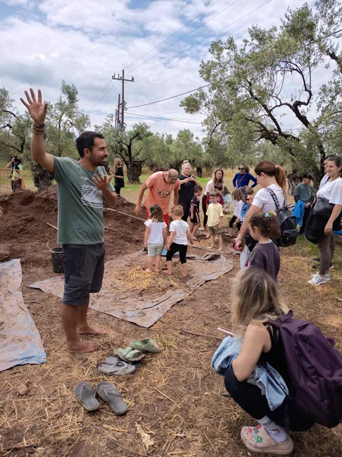 Η εθελοντική μας δράση δεν τελείωσε εδώ, στην επιστροφή κατευθυνθήκαμε στο εργαστήριο φυσικής δόμηση όπου μια ομάδα εθελοντών από διάφορες χώρες βρίσκονται εκεί για να βιώσουν έναν άλλο τρόπο ζωής, χτίζοντας με υλικά της φύσης, χώμα, άχυρο, πέτρες, ξύλο, μικρά σπιτάκια που αργότερα θα φιλοξενήσουν επισκέπτες!