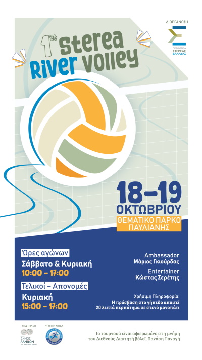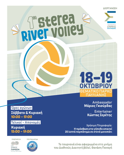 Η Περιφέρεια Στερεάς Ελλάδας ανακοινώνει τη διεξαγωγή διήμερου Περιφερειακού τουρνουά μικτών αγώνων βόλεϊ με την ονομασία: «1ο STEREA RIVER VOLLEY», υπό την αιγίδα της Ελληνικής Ομοσπονδίας Πετοσφαίρισης και με την υποστήριξη του Δήμου Λαμιέων.