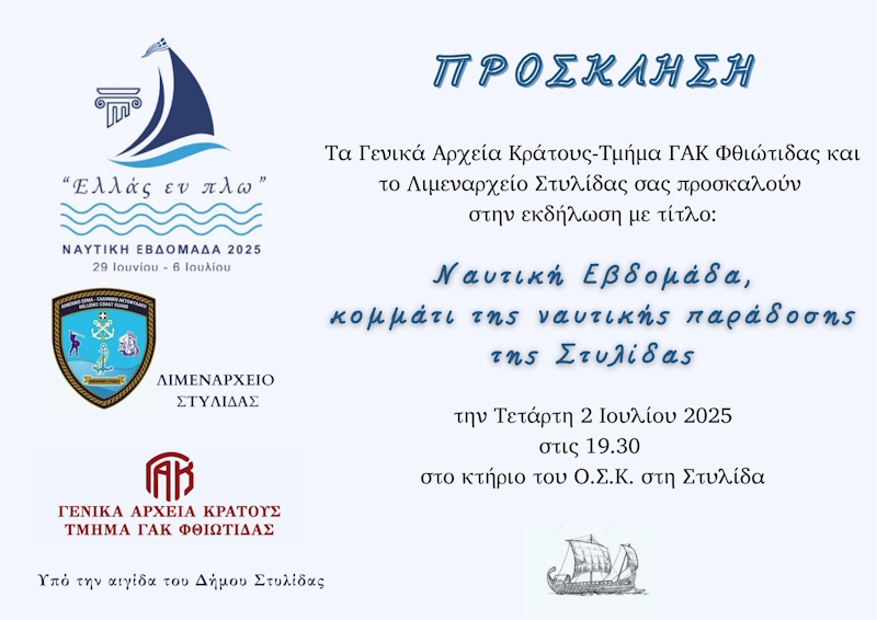 Ο θεσμός της Ναυτικής Εβδομάδας ως κομμάτι της ναυτικής παράδοσης της Στυλίδας θα παρουσιαστεί σε εκδήλωση που διοργανώνουν τα Γενικά Αρχεία του Κράτους-Τμήμα ΓΑΚ Φθιώτιδας με το Λιμεναρχείο Στυλίδας υπό την αιγίδα του Δήμου Στυλίδας. Στόχος της εκδήλωσης είναι η ανάδειξη της ναυτικής κληρονομιάς της περιοχής μας και της ναυτικής μας ιστορίας.