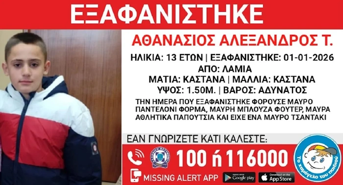 Συναγερμός σήμανε στις αρχές για την εξαφάνιση του 13χρονου Αθανάσιου Αλέξανδρου Τ., τα ίχνη του οποίου χάθηκαν το απόγευμα της Πέμπτης (01/01) από χώρο φιλοξενίας στην περιοχή της Λαμίας.
