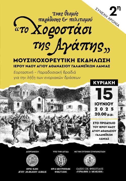 Για 2η συνεχή χρονιά η Ενορία του Αγίου Αθανασίου Γαλανέικων Λαμίας διοργανώνει την Κυριακή 15 Ιουνίου 2025 στις 20:00 μ.μ. με την ευχή του Σεβασμιωτάτου Ποιμενάρχου μας, Μητροπολίτου Φθιώτιδος κ. Συμεών την ετήσια μουσικοχορευτική εκδήλωση στο προαύλιο του Ναού επ’ ευκαιρία της λήξεως των ποικίλων ποιμαντικών ενοριακών δράσεων για την εκκλησιαστική χρονιά 2024 – 2025 με τίτλο: «Το Χοροστάσι της αγάπης».