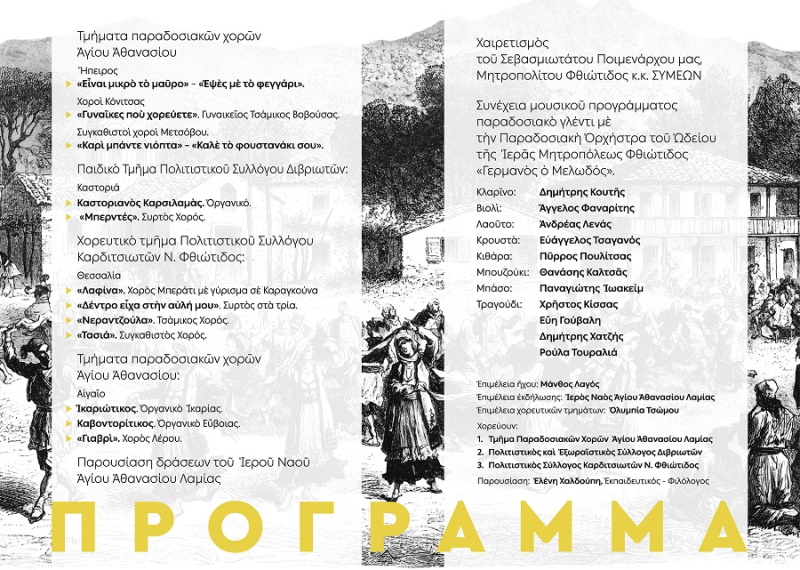 Τα Τμήματα Παραδοσιακών Χορών της Ενορίας μας και τα μέλη των Πολιτιστικών Συλλόγων Διβριωτών και Καρδιτσιωτών θα χορέψουν παραδοσιακά τραγούδια αφιερωμένα απ’ όλη την Ελλάδα.