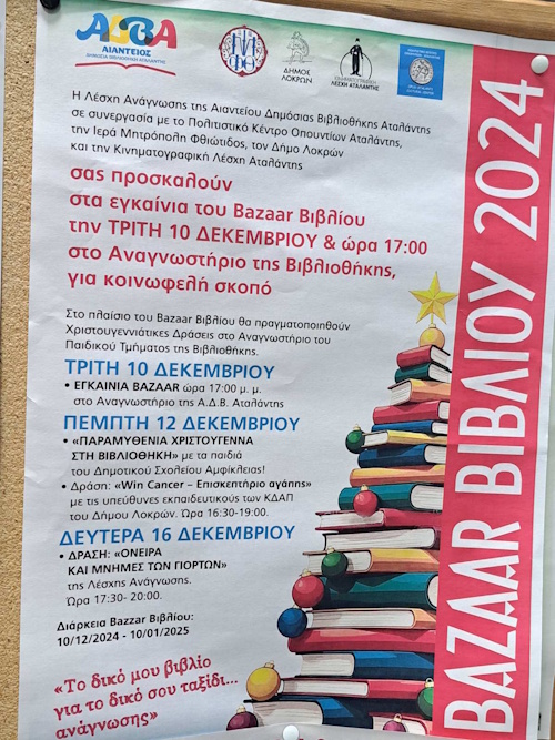 Πραγματοποιήθηκαν σήμερα στην Αιάντειο Δημόσια Βιβλιοθήκη Αταλάντης τα εγκαίνια του Χριστουγεννιάτικου Bazaar βιβλίου από τον Σεβασμιώτατο Μητροπολίτη Φθιώτιδος κ. κ. Συμεών, Πρόεδρο του Εφορευτικού Συμβουλίου της Βιβλιοθήκης.