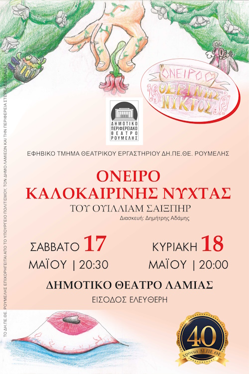Το Εφηβικό Τμήμα του Θεατρικού Εργαστηρίου του ΔΗ.ΠΕ.ΘΕ. Ρούμελης παρουσιάζει την παράσταση «Όνειρο Καλοκαιρινής Νύχτας» του Ουίλλιαμ Σαίξπηρ, σε διασκευή του Δημήτρη Αδάμη, το Σάββατο 17 και την Κυριακή 18 Μαΐου, στο Δημοτικό Θέατρο Λαμίας.