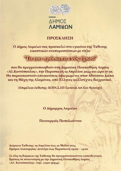 Οι επετειακές εορταστικές εκδηλώσεις θα ξεκινήσουν με τα εγκαίνια της Έκθεσης εικαστικών αναπαραστάσεων με τίτλο : «Τα 100 Πρόσωπα Ενός Ήρωα», που θα πραγματοποιηθούν στη Δημοτική Πινακοθήκη Λαμίας «Αλ. Κοντόπουλος», την Παρασκευή 19 Απριλίου 2024 και ώρα 17:30. Θα παρουσιαστούν απεικονίσεις αφιερωμένες στον Αθανάσιο Διάκο και την Μάχη της Αλαμάνας, από Έλληνες καλλιτέχνες διαχρονικά.