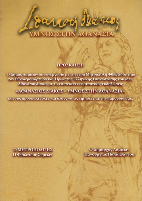 Ο Δήμος Λαμιέων σε συνεργασία με την Ιερά Μητρόπολη Φθιώτιδος τιμά τον Εθνοϊερομάρτυρα και Ήρωα της Ελληνικής Επανάστασης του 1821, Αθανάσιο Διάκο, με τις επετειακές εορταστικές εκδηλώσεις «ΑΘΑΝΑΣΙΟΣ ΔΙΑΚΟΣ – ΥΜΝΟΣ ΣΤΗΝ ΑΘΑΝΑΣΙΑ» και σας προσκαλεί όλες και όλους να τις τιμήσετε με την παρουσία σας.