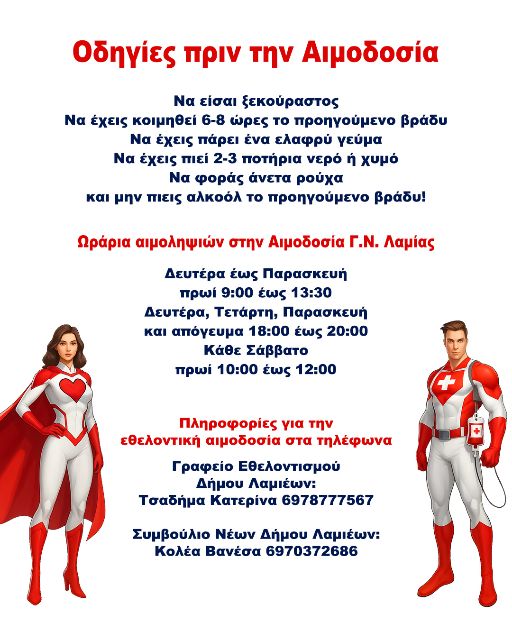 Το Συμβούλιο Νέων του Δήμου Λαμιέων μαζί με το Γραφείο Εθελοντισμού και σε συνεργασία με το Τμήμα Αιμοδοσίας του Γενικού Νοσοκομείου Λαμίας διοργανώνουμε δράση εθελοντικής αιμοδοσίας και δωρεάς μυελού των οστών, αύριο, Σάββατο 6 Δεκεμβρίου από τις 10:00 έως τις 14:00, στο παλαιό Δημαρχείο (Σκληβανιώτη 8).